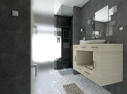 La salle de bain attenante propose une ambiance épurée. La pierre, le bois brut, la laque blanche et le métal chromé s’allient en toute quiétude. La chambre à coucher s’accompagne d’une zone de méditation. L’ensemble de la chambre tourne autour d’un jardin zen sec.