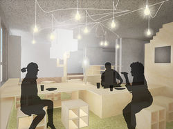 Auprès de mon arbre propose une architecture tel un décor de théâtre. Ici, les morceaux de contreplaqué sont assemblés pour produire un bar, un espace de restauration, un coin de pause et un rendez-vous gourmand et artistique. Sous un arbre schématisé numériquement en 3D, émetteur d’une lumière diffuse, le public découvre un univers festif comme une fête de village remise au goût du jour. L’aspect éphémère de l’espace tient aux assemblages découpés numériquement en atelier qui sont très rapides de montage et de démontage dans l’espace du centre culturel. Assemblées, les plaques produisent un dépliage dans le hall, un pop-up à échelle humaine. Pour la restauration sur place, les produits bio et en circuit court sont mis à l’honneur dans un panel de recettes slow food vitaminées et goûteuses.